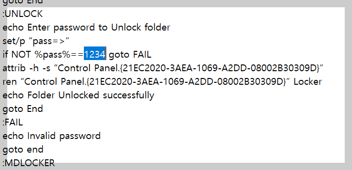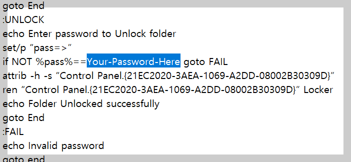 | cls @ECHO OFF title Folder Locker if EXIST “Control Panel.{21EC2020-3AEA-1069-A2DD-08002B30309D}” goto UNLOCK if NOT EXIST Locker goto MDLOCKER :CONFIRM echo Are you sure u want to Lock the folder(Y/N) set/p “cho=>” if %cho%==Y goto LOCK if %cho%==y goto LOCK if %cho%==n goto END if %cho%==N goto END echo Invalid choice. goto CONFIRM :LOCK ren Locker “Control Panel.{21EC2020-3AEA-1069-A2DD-08002B30309D}” attrib +h +s “Control Panel.{21EC2020-3AEA-1069-A2DD-08002B30309D}” echo Folder locked goto End :UNLOCK echo Enter password to Unlock folder set/p “pass=>” if NOT %pass%==Your-Password-Here goto FAIL attrib -h -s “Control Panel.{21EC2020-3AEA-1069-A2DD-08002B30309D}” ren “Control Panel.{21EC2020-3AEA-1069-A2DD-08002B30309D}” Locker echo Folder Unlocked successfully goto End :FAIL echo Invalid password goto end :MDLOCKER md Locker echo Locker created successfully goto End :End |