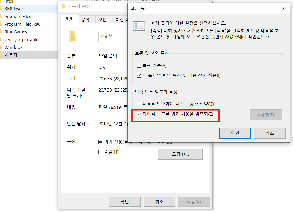 원하는 폴더에서 우클릭 - 속성 -고급 - 데이터보호를 위해 내용을 암호화 하여