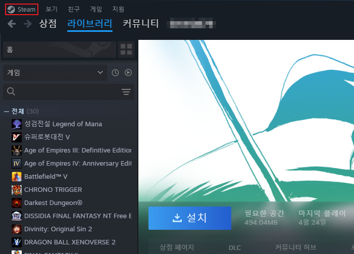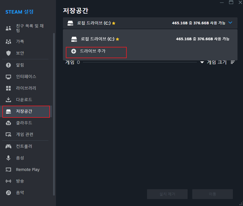 스팀 좌측 상단 - 설정 - 저장공간 - 드라이브추가